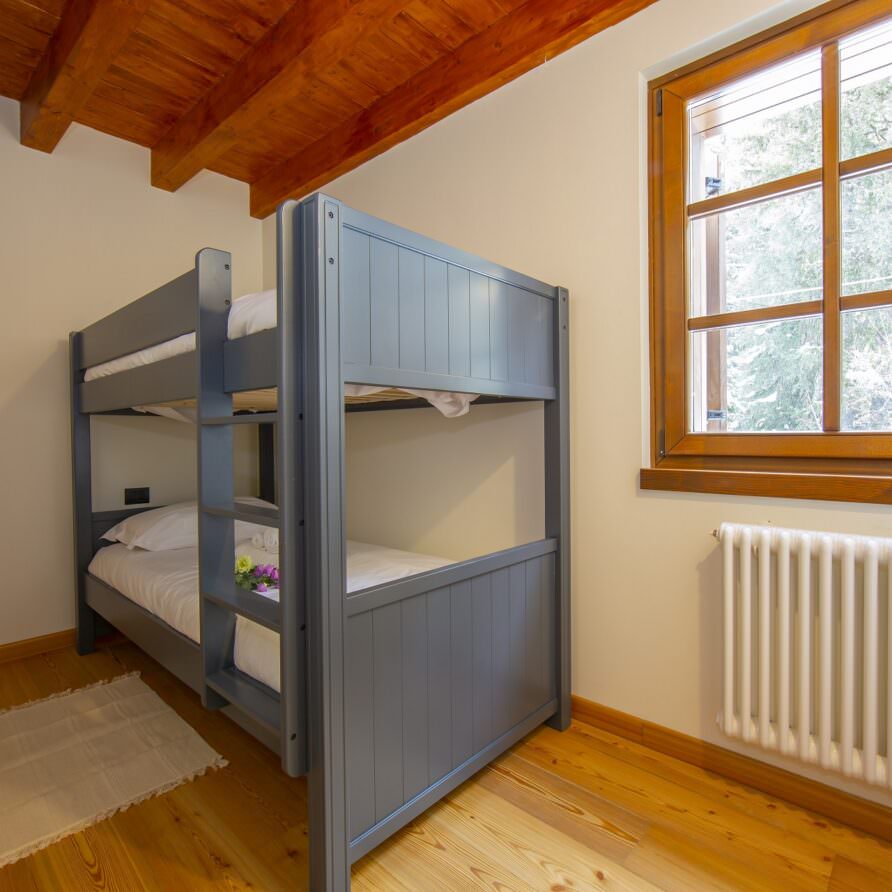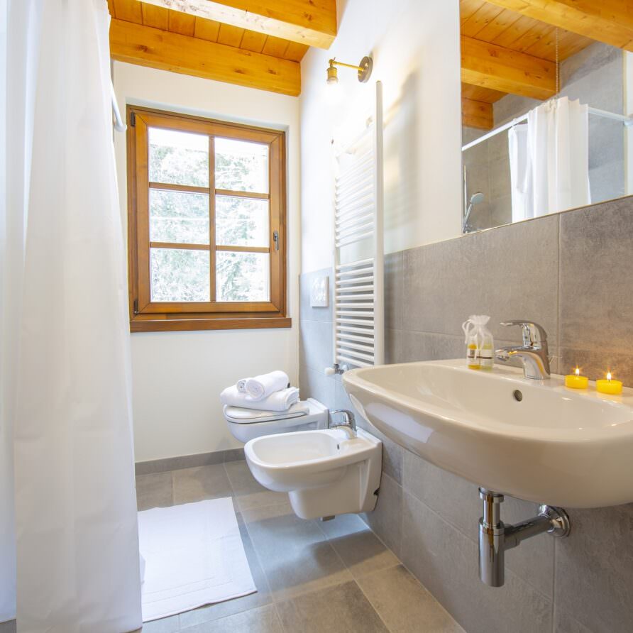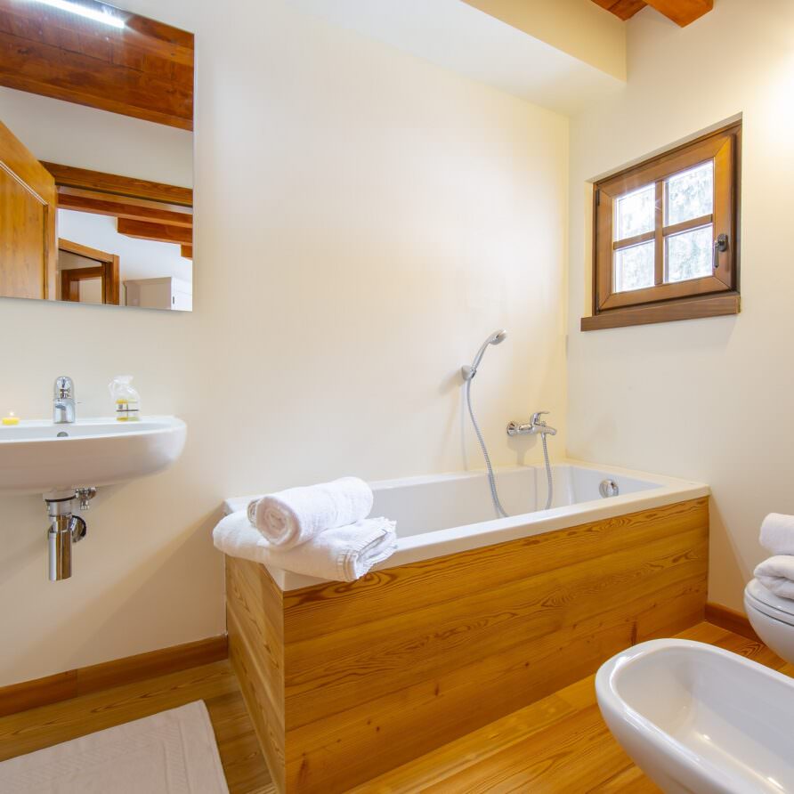 Spazioso appartamento completamente nuovo con arredo richiamante la montagna ma in stile moderno e funzionale, composto da un ingresso con confortevole salotto e zona tv, tavolo da pranzo ideale per 6 persone e cucina a vista attrezzata (lavastoviglie, frigorifero di medie dimensioni, 4 fuochi a gas, forno, cappa, bollitore, macchina caffè Lavazza A Modo Mio, lavatrice), 3 camere da letto, di cui due con letti a castello 90×190 ed una matrimoniale con bagno en suite, l’appartamento è dotato anche di un secondo comodo bagno.